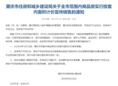 中新网 5月7日电 近日,广东肇庆市住房和城乡建设局发布的通知显示,从2024年5月1日起,肇庆市范围内商品房实行按套内面积计价宣传销售。同时公布的《肇庆市促进房地产业高质量发...