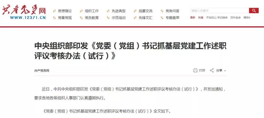 19.中共中央组织部印发《党委(党组)书记抓基层党建工作述职评议考核办法(试行)》