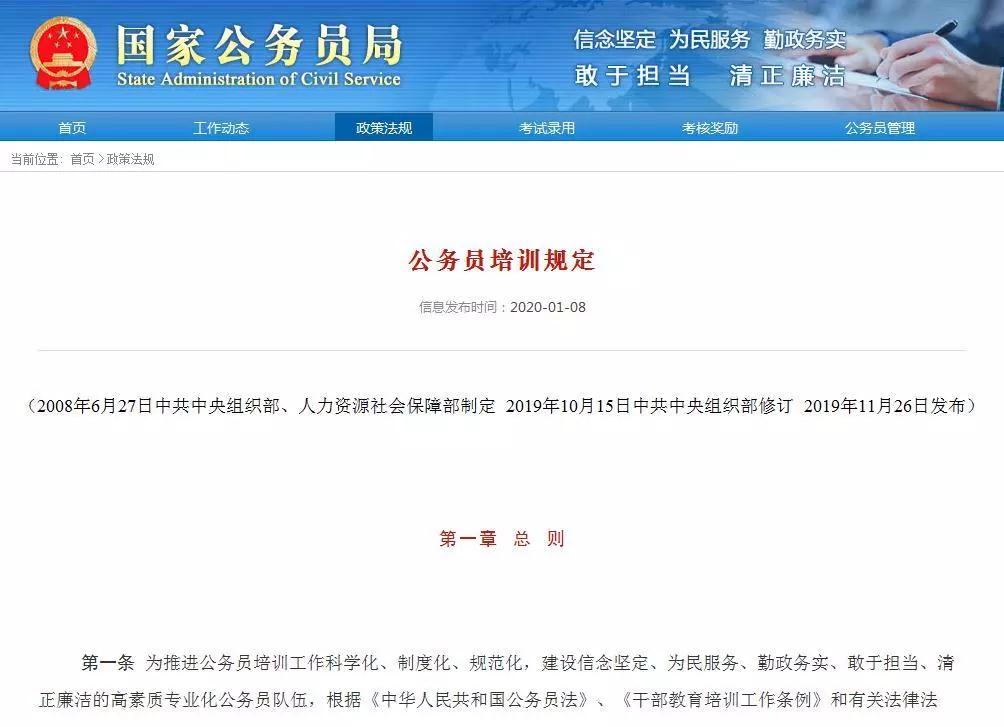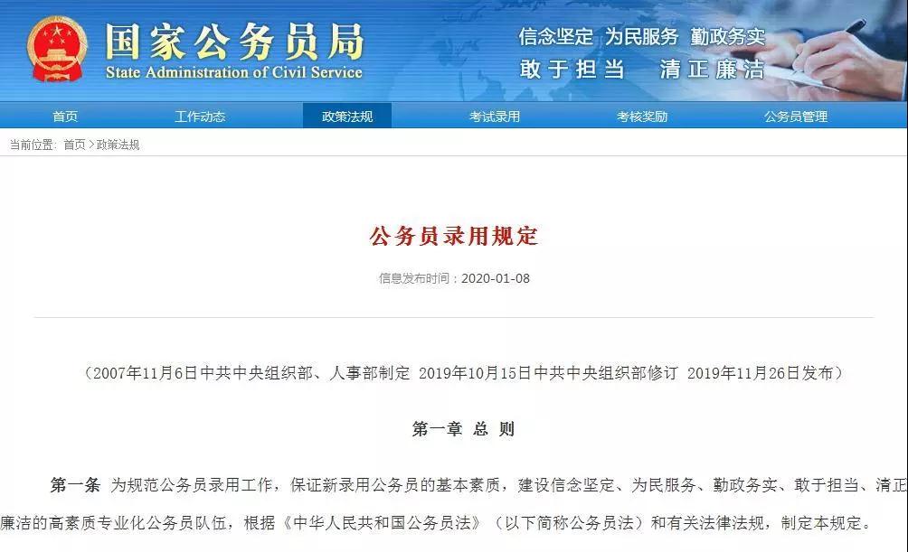 2020年1月8日国家公务员局官网发布《公务员录用规定》。本规定是为规范公务员录用工作,保证新录用公务员的基本素质,建设信念坚定、为民服务、勤政务实、敢于担当、清正廉洁的高素质专业化公务员队伍,根据《中华人民共和国公务员法》和有关法律法规制定。