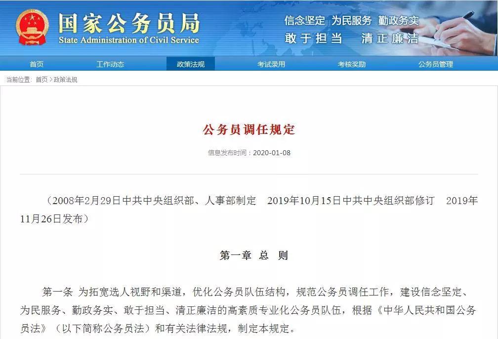 2020年1月8日国家公务员局官网发布《公务员调任规定》。本规定为拓宽选人视野和渠道,优化公务员队伍结构,规范公务员调任工作,建设信念坚定、为民服务、勤政务实、敢于担当、清正廉洁的高素质专业化公务员队伍,根据《中华人民共和国公务员法》和有关法律法规制定。