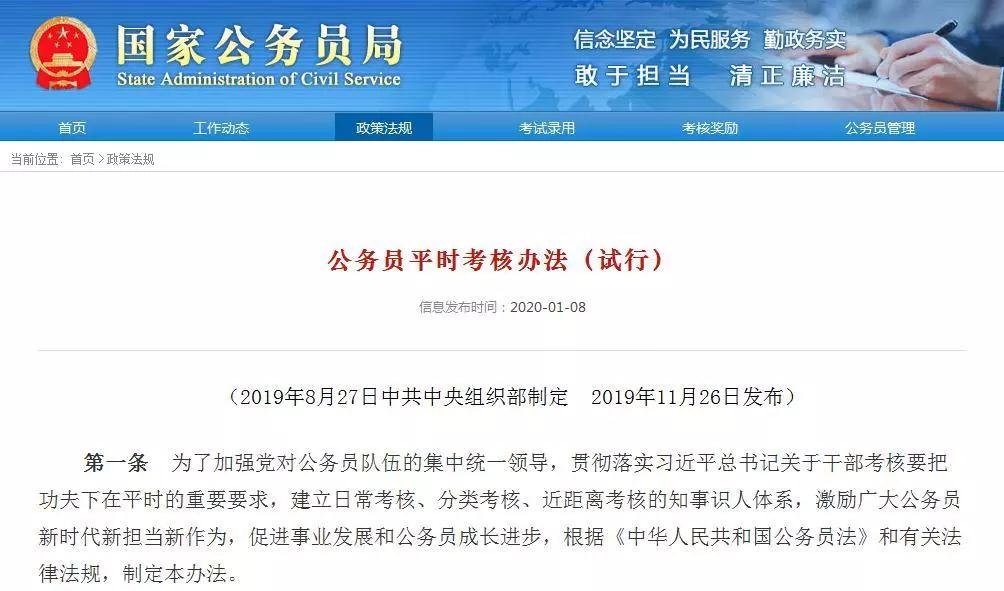 2020年1月8日国家公务员局官网发布《公务员平时考核办法(试行)》。本办法为了加强党对公务员队伍的集中统一领导,贯彻落实习近平总书记关于干部考核要把功夫下在平时的重要要求,建立日常考核、分类考核、近距离考核的知事识人体系,激励广大公务员新时代新担当新作为,促进事业发展和公务员成长进步,根据《中华人民共和国公务员法》和有关法律法规制定。 (责任编辑:administrator) |