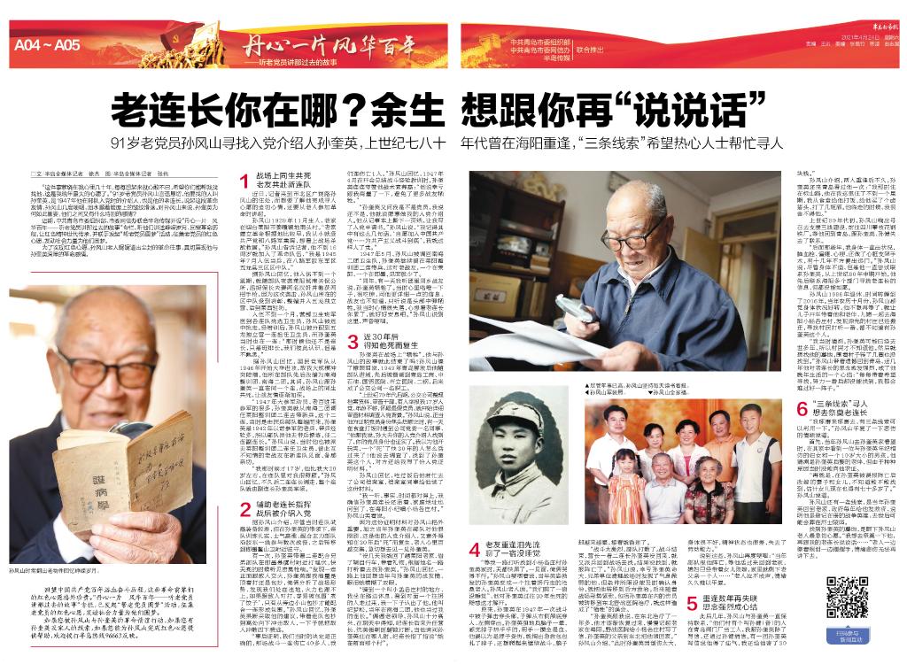 “这件事萦绕在我心里几十年了,每每想起就心酸不已,希望你们能帮我找找他,这是我晚年最大的心愿了。”91岁高龄的老党员孙风山言语恳切。孙风山要找的这个人叫孙奎英,是1947年他在部队时的入党介绍人,也是他的老连长。说起孙奎英,老人几度哽咽,泪水顺着他脸庞上的皱纹滑落。这个人对孙风山来说为何如此重要,他们之间的感情又有什么特别? 近期,中共青岛市委组织部、市委网信办联合半岛传媒开设“丹心一片风华百年——听老党员讲那过去的故事”专栏,听他们讲述峥嵘岁月、回望革命历程,让红色精神世代传承,并在这期间联手发起“帮老党员圆梦”活动,征集老党员的心愿,发动社会力量为他们圆梦。 为了帮孙风山老人完成这个红色心愿,近日,记者来到市北区广饶路老人的住处,听他娓娓道来尘封的革命往事,真切体会到了他与老连长孙奎英深厚的革命感情。