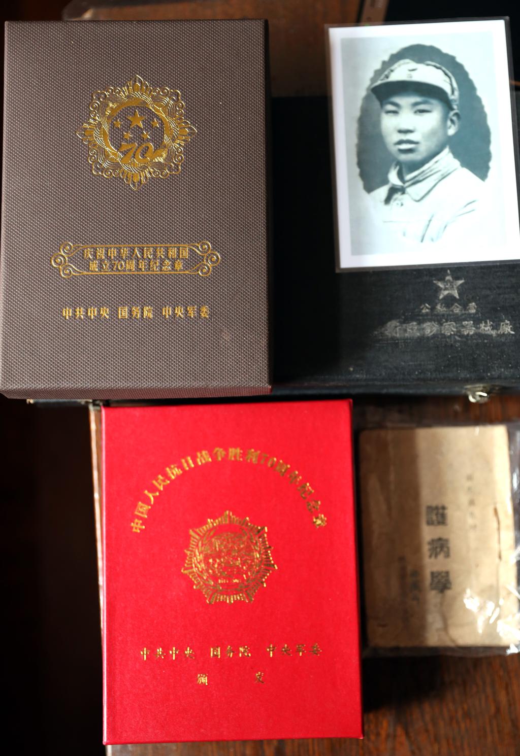 孙风山被授予的庆祝中华人民共和国成立70周年纪念章,以及参军时的一些老物件。 “上世纪70年代后期,公交公司整理档案资料、审查干部,有人举报我17岁入党年龄不够,怀疑是假党员,就开始详细审查材料调查入党背景。”孙风山老人说,正在他焦头烂额之时,有一天到食堂打饭遇到了公司党委一位姓刘的同事,“他跟我说,孙大夫,你的入党介绍人找到了,你的党员身份证实了。我以为他开玩笑,一个‘死’了快30年的人怎么活过来了。他说去调查了,找到了孙奎英这个人,孙奎英还给我写了份入党证明材料。”老人回忆,当天吃过饭后他赶忙去了公司档案室,档案室同事读了这份材料,“我一听,事实、时间都对得上,我确信孙奎英连长还活着,家庭地址也问到了,在海阳小纪镇小杨各庄村。”老人笑着说。 因为这份证明材料对孙风山老人格外重要,加之当年孙奎英在部队对自己很照顾,是自己的入党介绍人,又意外得知在30年后“死”而复生,老人心里百感交集,急切想去见一见他。“没几天我就回了莱阳老家,借了辆自行车,带着礼物,根据地名一路打听着去找孙奎英。”老人回忆,一路上他回想当年与孙奎英的战友情,眼泪模糊了双眼,“骑到一个叫小孟各庄村的地方,我坐在路边休息,看到对面一个拄拐的人走过来,我一下子认出了他。他叫纪梦松,当年在南海二团,他也当过我的连长。”偶遇老首长,孙风山十分高兴,聊天中得知,纪连长后来升了营长,在抗美援朝战争中腿被打断了,而当他询问孙奎英住在哪儿时,纪连长指了指前面说,就在前面那个村。 再重逢泪先流,彻夜长聊解疑惑 “等我一路打听找到了小杨各庄村孙奎英的家,天都快黑了。一见面,俺俩哭得不行。”孙风山哽咽着说,当年英姿勃发的孙奎英变成了一个拄着拐行走的沧桑老人。“我们聊了一宿没睡觉”,孙风山老人说,一整宿的聊天中,他对孙奎英过往30年生死的疑惑这才解开。 原来,孙奎英在1947年一场战斗中被子弹打穿头部,子弹从右侧颅底穿进,从左侧穿出,倒地后他晕乎乎的,感觉脖子热乎乎的,一摸全是血,孙奎英误以为是脖子受伤,就掏出急救包包扎了脖子,还想爬起来继续战斗,却越来越晕,紧接着昏迷了。“战斗太激烈,部队打散了,结束战斗回到营部后,营长一看二连长孙奎英没回来,就又派兵回到战场去找,没找到,就报阵亡了。”孙风山老人讲述说,在这期间,孙奎英命大,有别的连队战士清理战场时发现了气息微弱的孙奎英,但并不认识他是连长,就把他转移到后方救治。后来随着战情紧张,伤员转移到东北野战医院治疗,就这样造成了孙奎英阵亡的误会。